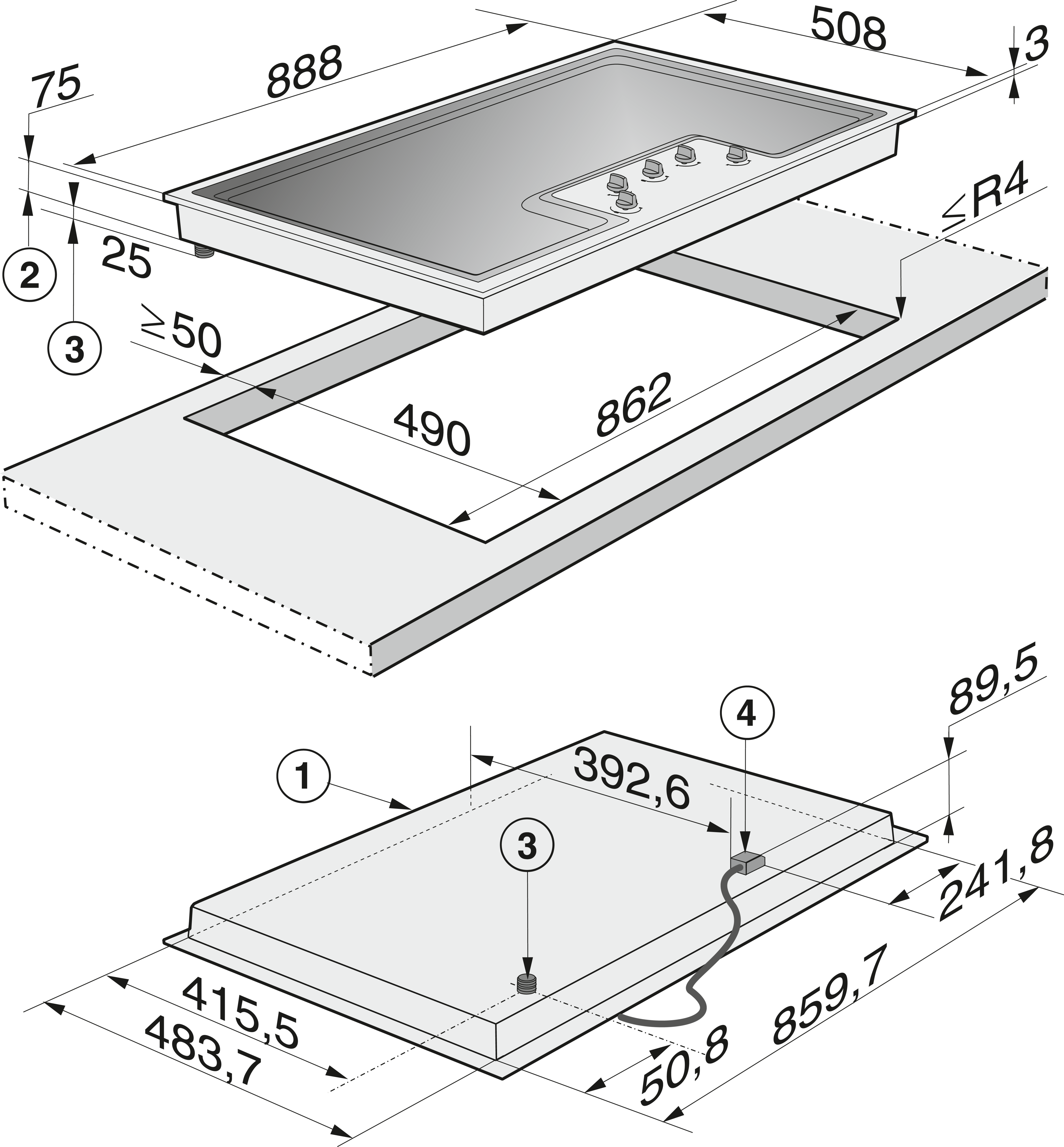 Размеры выреза (Ш х Г), установка на поверхности, в мм