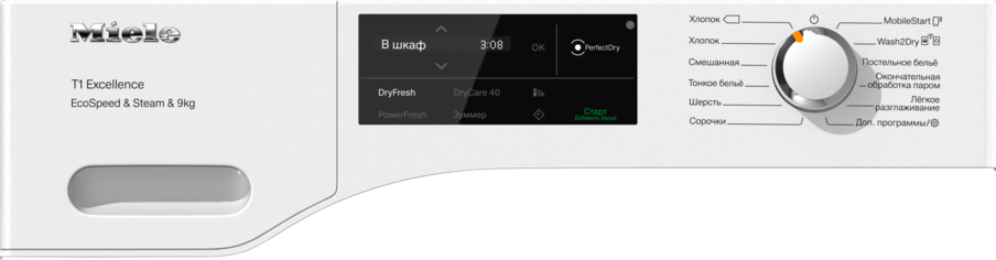 T1, сушильная машина с тепловой помпой: Функции SteamFinish, DryCare 40 и SilenceDrum – для деликатной сушки.