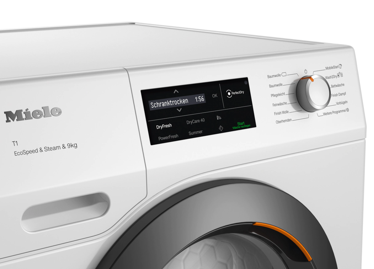 Сушильная машина с тепловым насосом T1: с SteamFinish, DryCare 40 и SilenceDrum для бережной сушки.